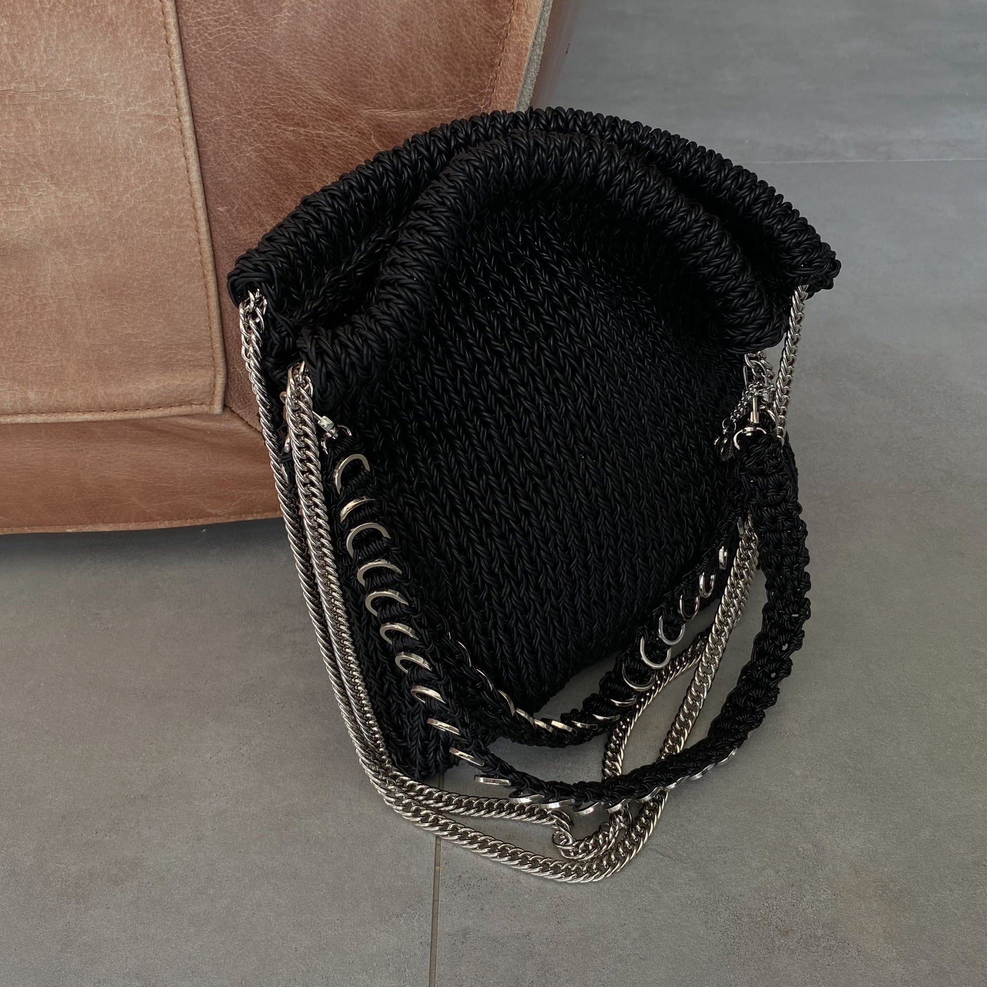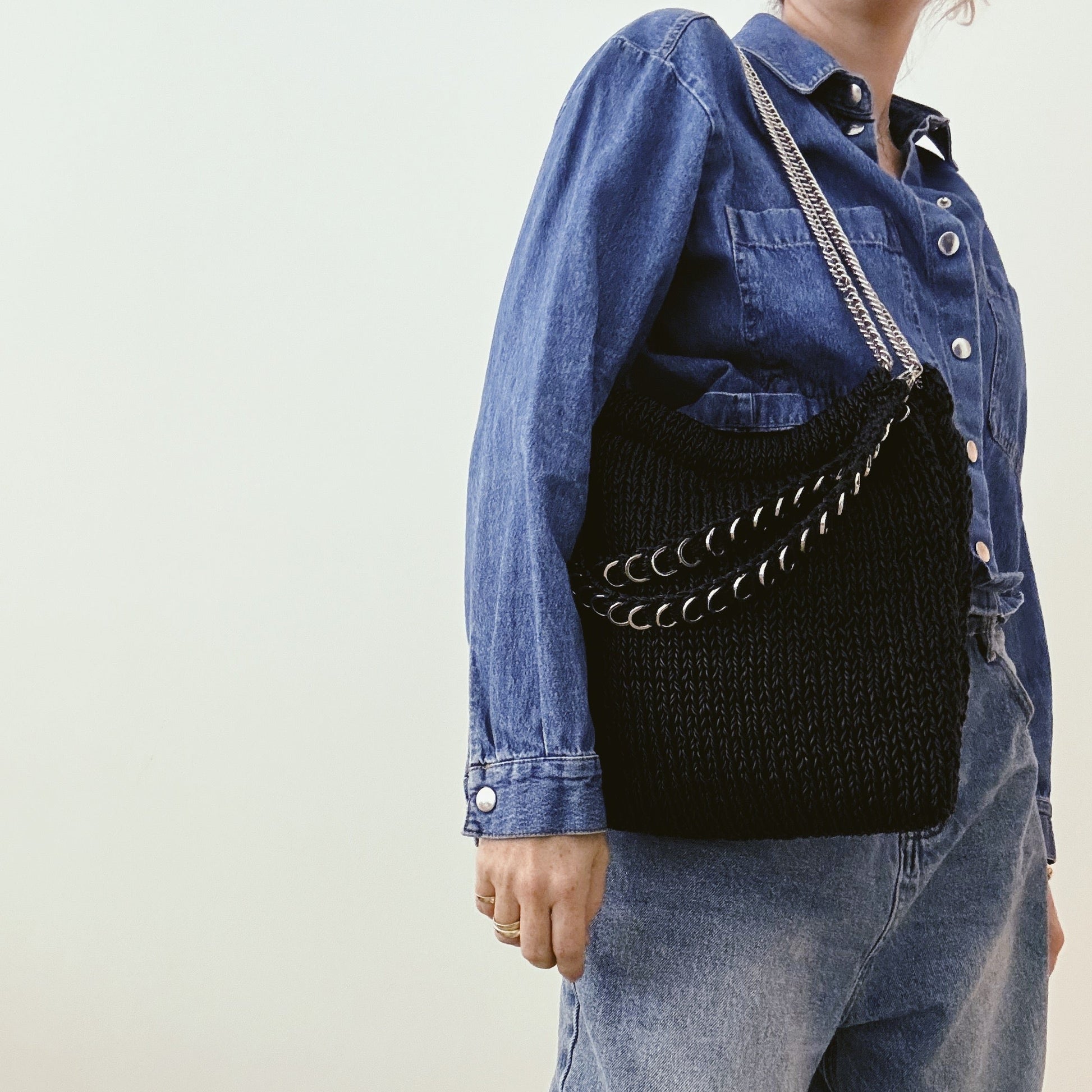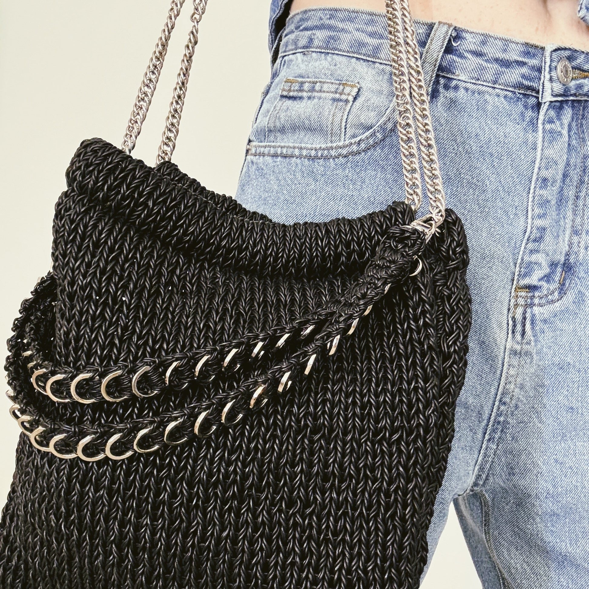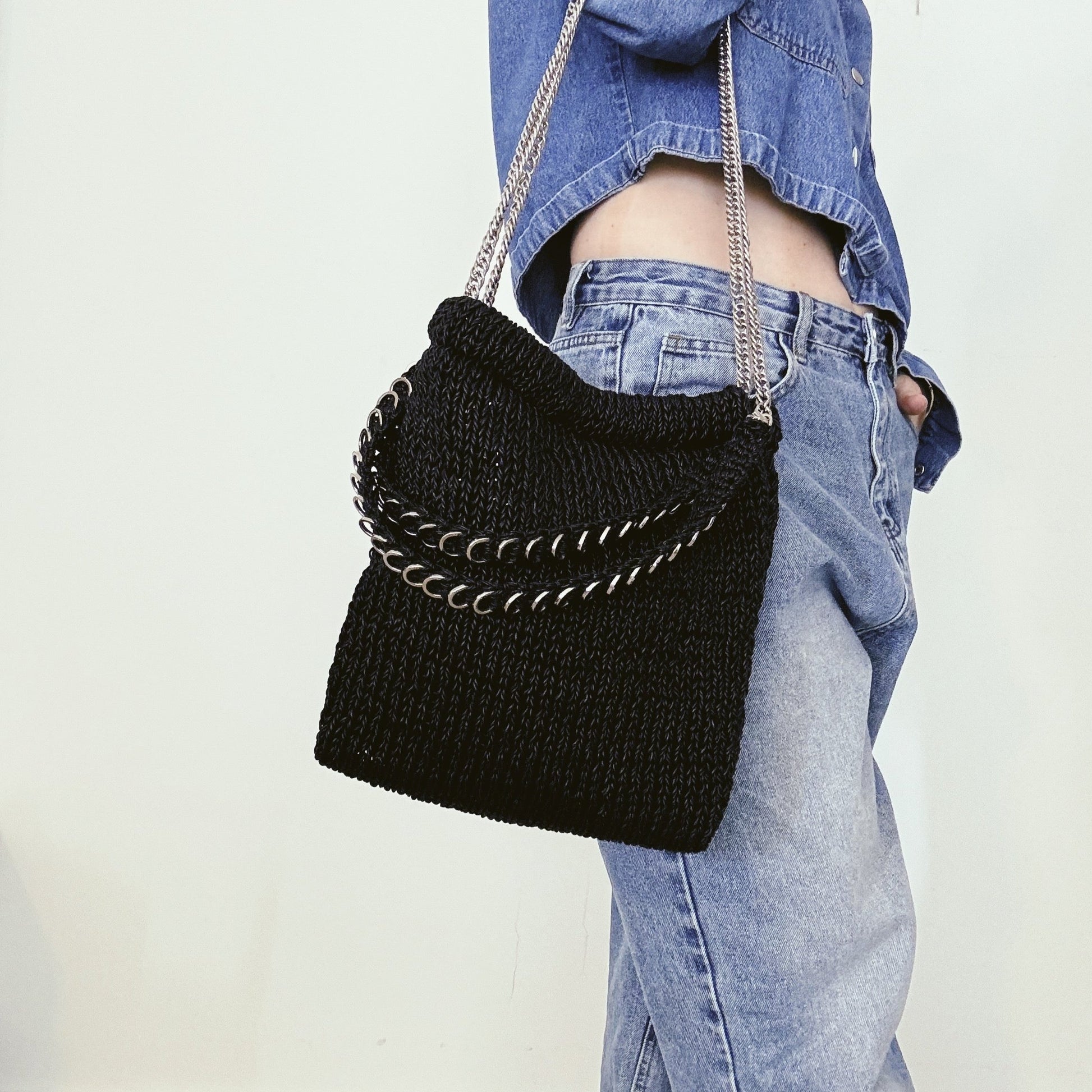 Timeless and versatile, The Tote Bag is a hand-knitted leather accessory designed for both style and practicality. Featuring a classic tote shape, this bag is crafted from genuine leather and accented with sleek silver-finish hardware. The shoulder chain strap and D-ring detailed handles add functionality and elegance, while the magnetic closure ensures your belongings stay secure. Its unlined interior highlights its modern and minimalist design, making it perfect for any occasion.